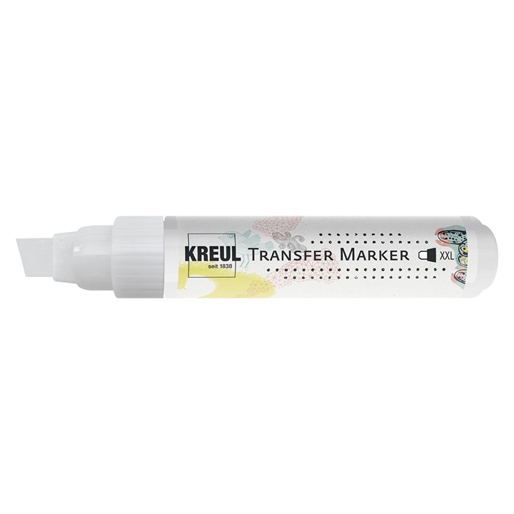 DerKREUL Transfer Marker ist ein Spezialstift für die einfache Übertragung von Bildern aus dem Laserdrucker auf Dekorationsartikel. Verschiedene Beschriftungen oder Motive können mit Hilfe dieses innovativen transparenten Stiftes Transfer Marker XXL sehr schnell und spielerisch übertragen werden. Der Transfer eignet sich für verschiedenste Oberflächen wie Holz, Terrakotta, Papier, Moosgummi, Keramik, Textilien aus Naturfasern. Übertragene Bilder auf der Oberfläche sehen aus wie gedruckt. Der Marker wird auf der Basis von Lösungsmitteln hergestellt.