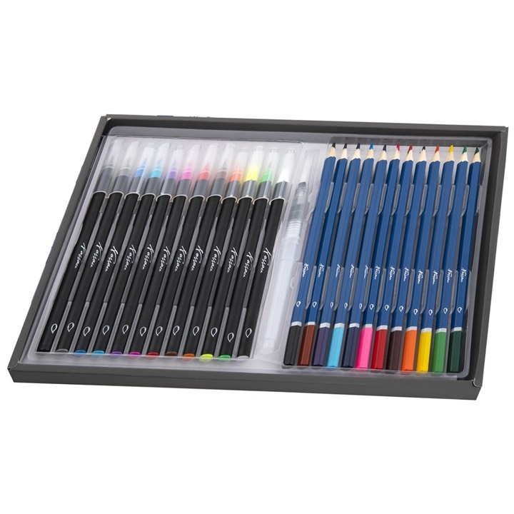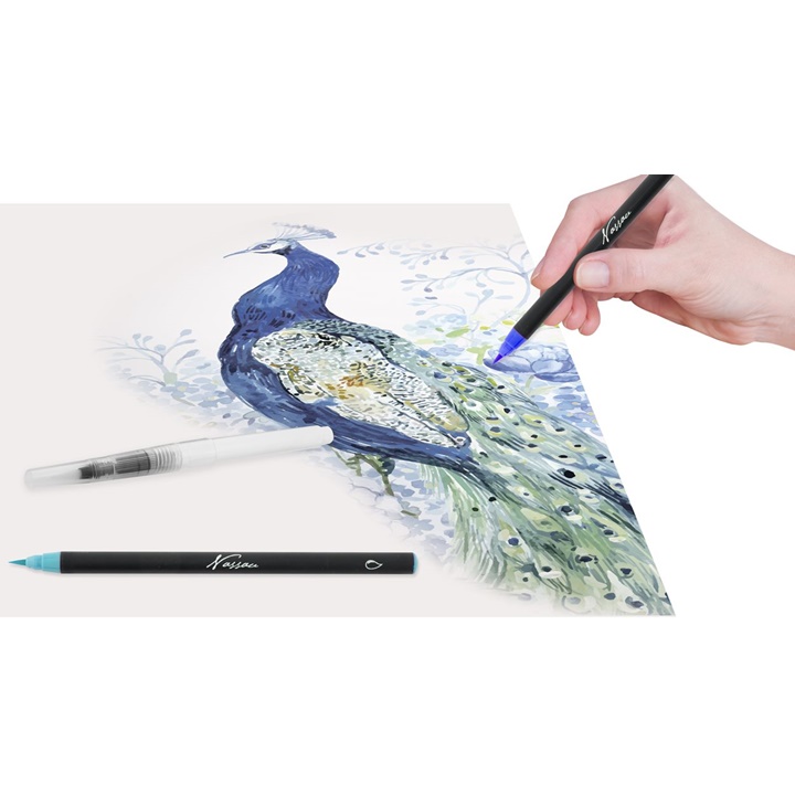 Das kreative Set mit Aquarellstiften und -farben wird alle Aquarellliebhaber begeistern. Das Aquarellmarker-Set Nassau Fine Art mit Tinte auf Wasserbasis sorgt für ein perfektes Erlebnis bei jedem Bild. Die Marker sind sowohl für Anfänger als auch für Fortgeschrittene geeignet. Er kann sowohl auf trockenem als auch auf feuchtem Papier verwendet werden. Im Set ist auch ein nachfüllbarer Wasserpinsel enthalten, mit dem Sie einzigartige Aquarelleffekte erzeugen können. Die mit Aquarellfarben erstellten Zeichnungen können mit Wasser gemischt werden, wodurch schöne Aquarellbilder entstehen.